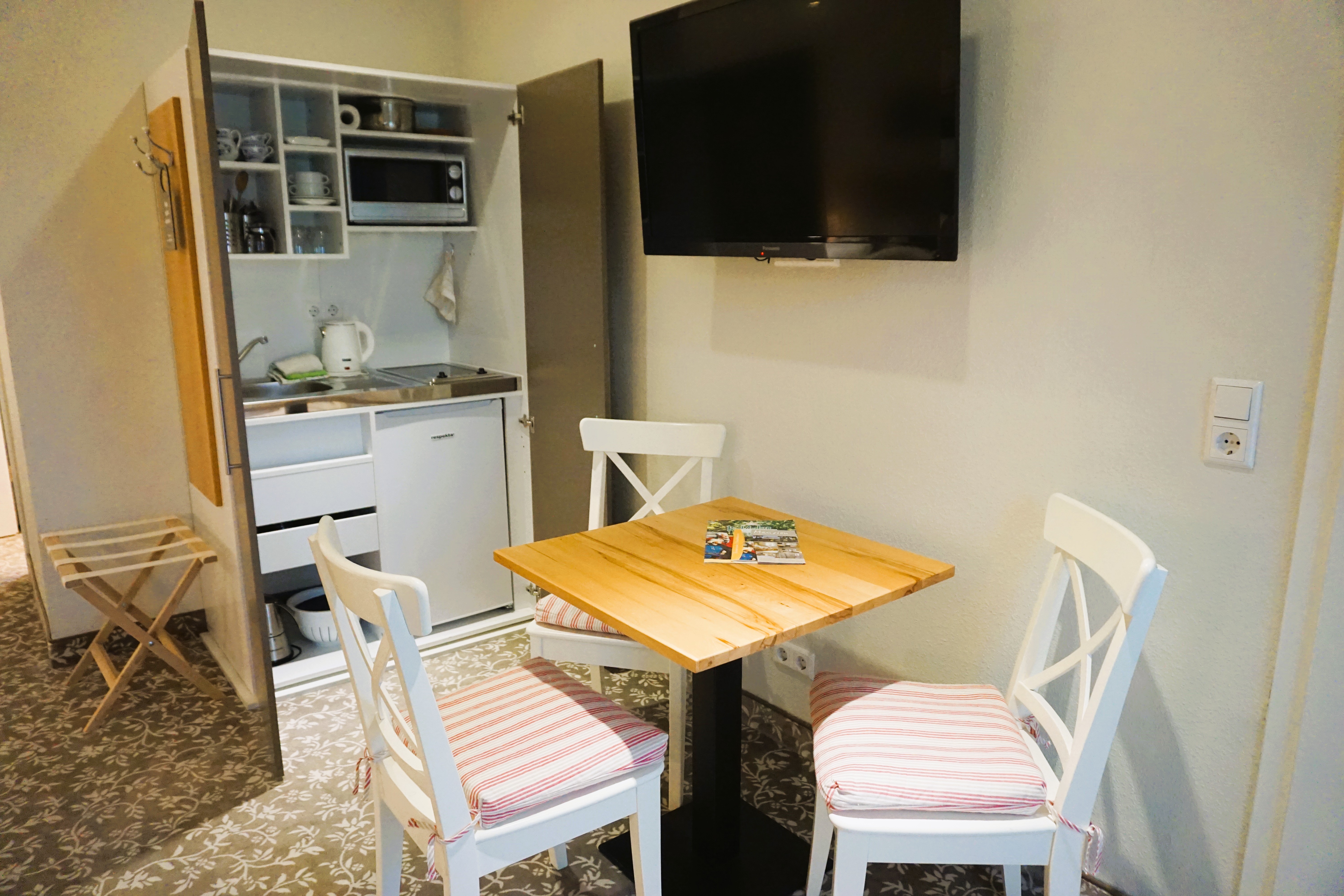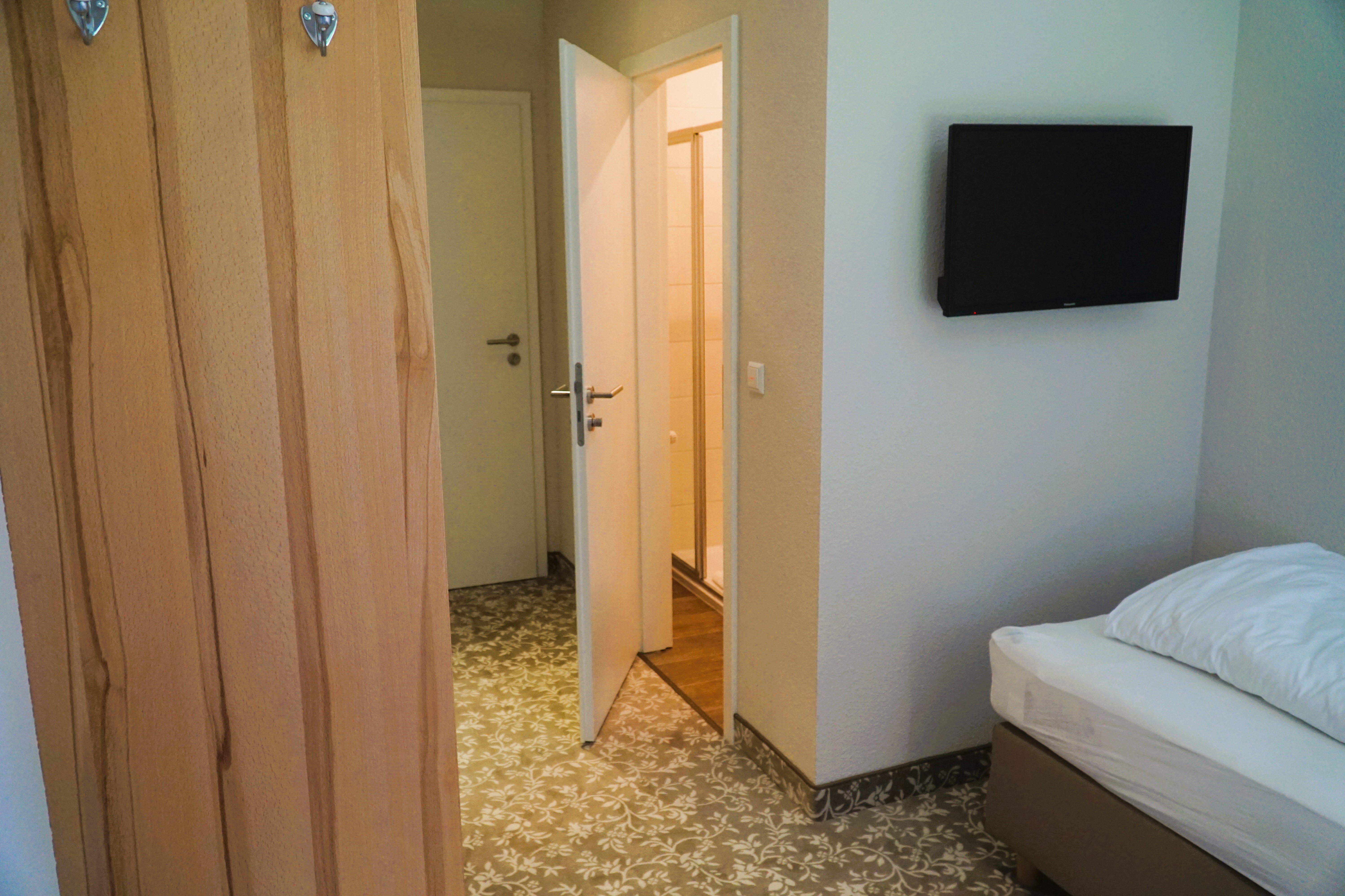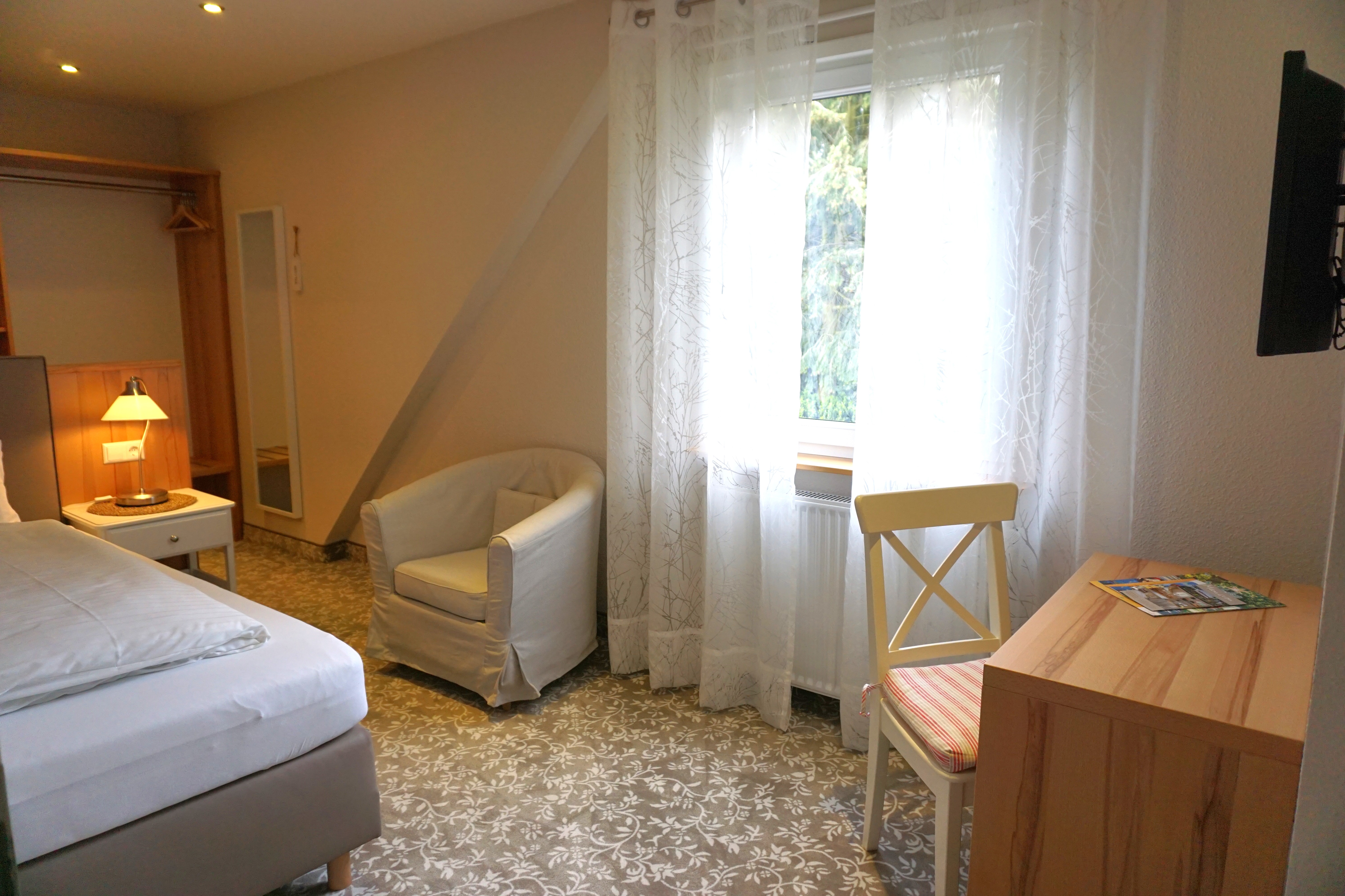 ... is on the first floor with a side view to the forests and is equipped with a single bed (1.00 x 2.00 m), satellite TV, free WiFi, shower and hairdryer. Bed linen, towels, soap and shower gel/ shampoo are part of the equipment.