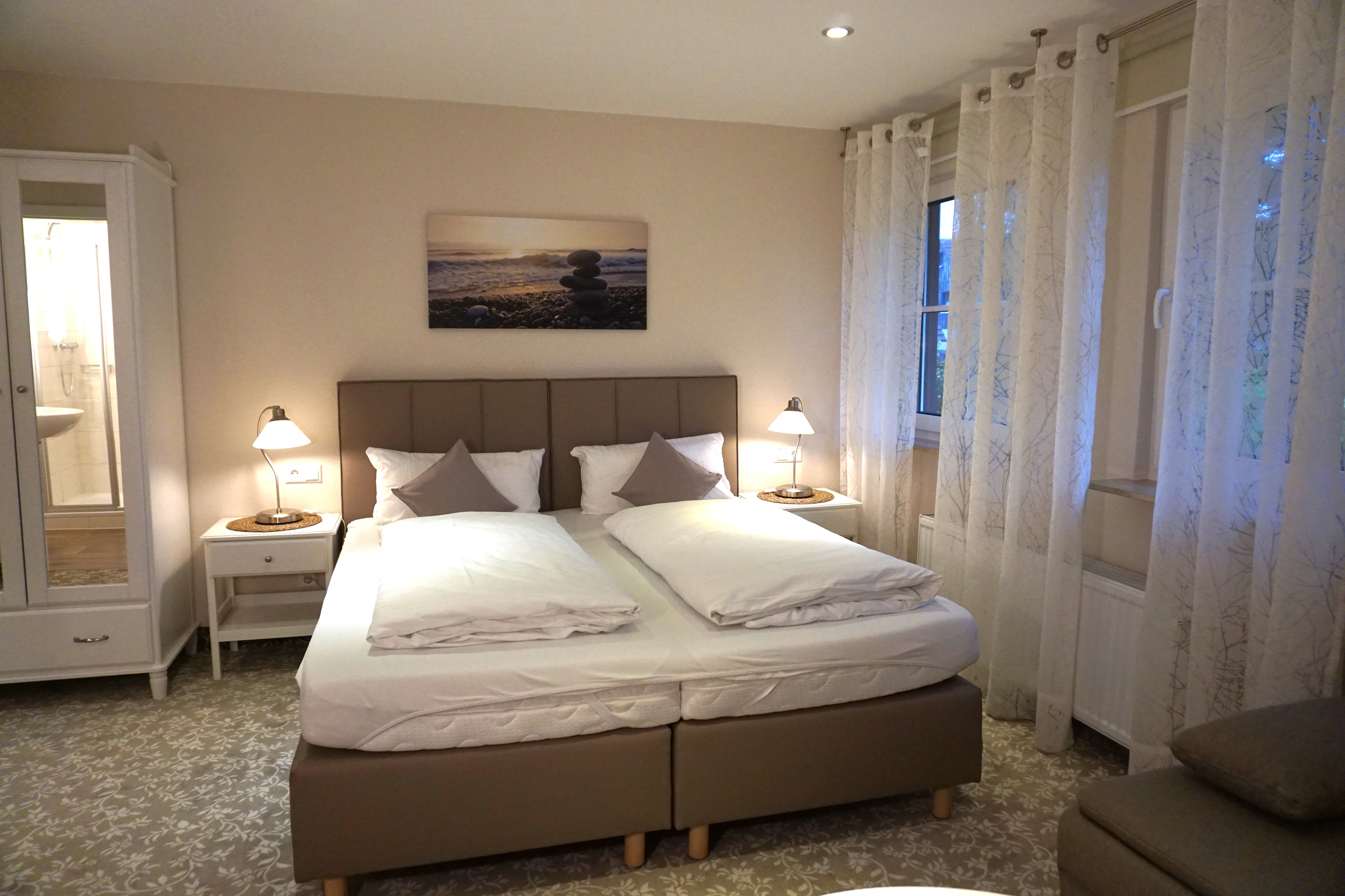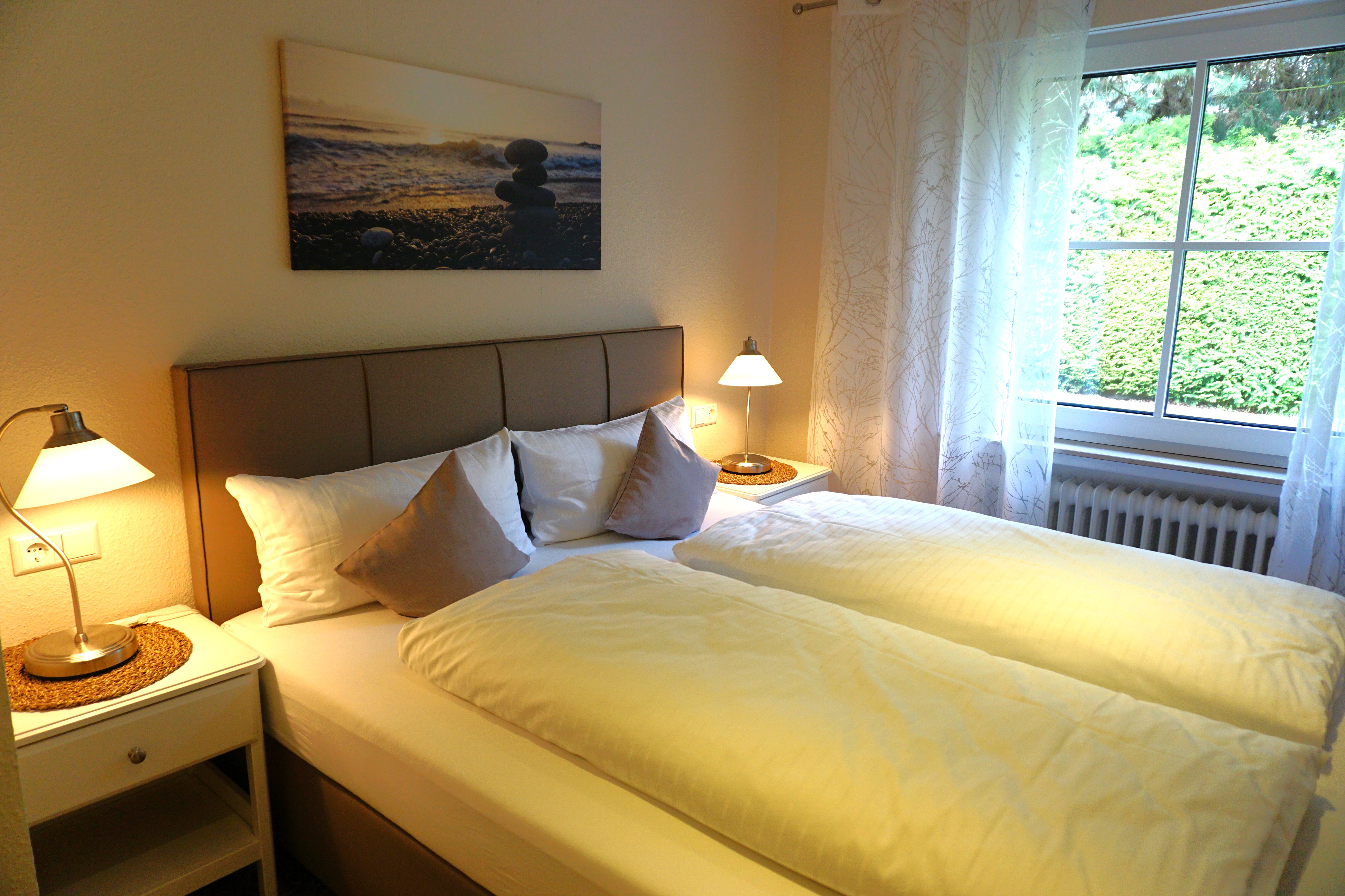 ... is on the ground floor with a view to the garden and is equipped with a queen-size bed (1.60 x 2.00 m), desk, satellite TV, free WiFi, shower and hairdryer. Bed linen, towels, soap and shower gel/ shampoo are part of the equipment.