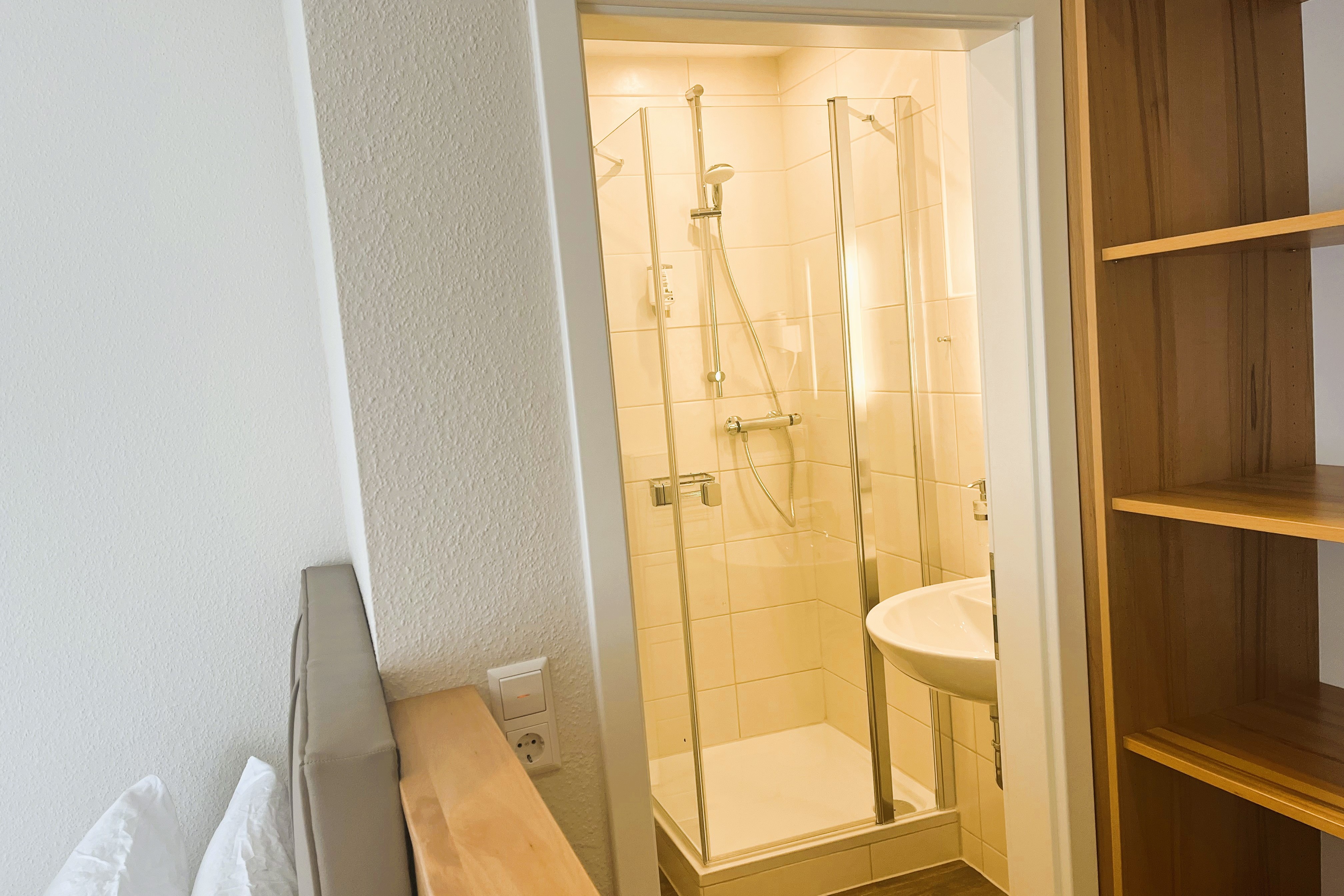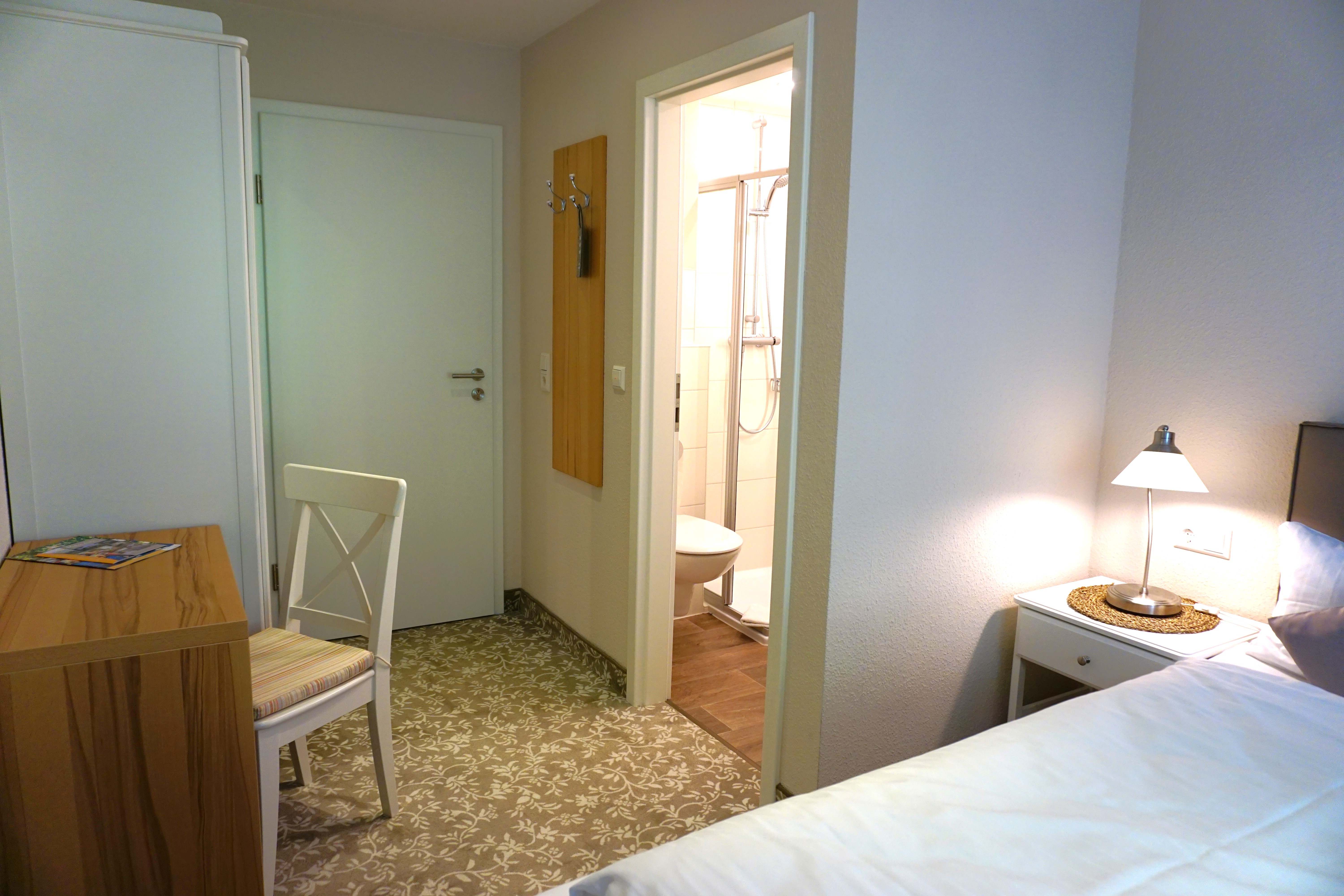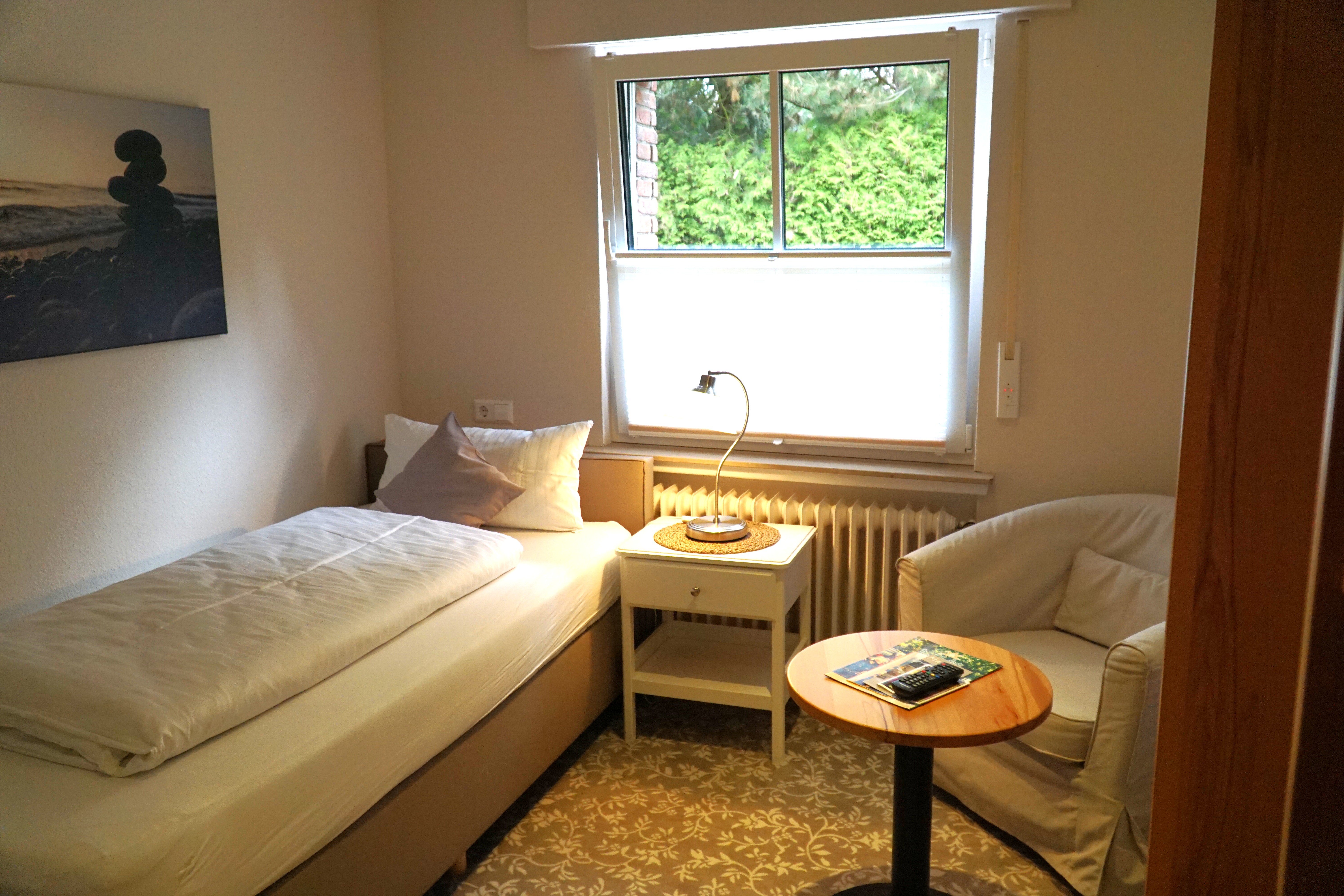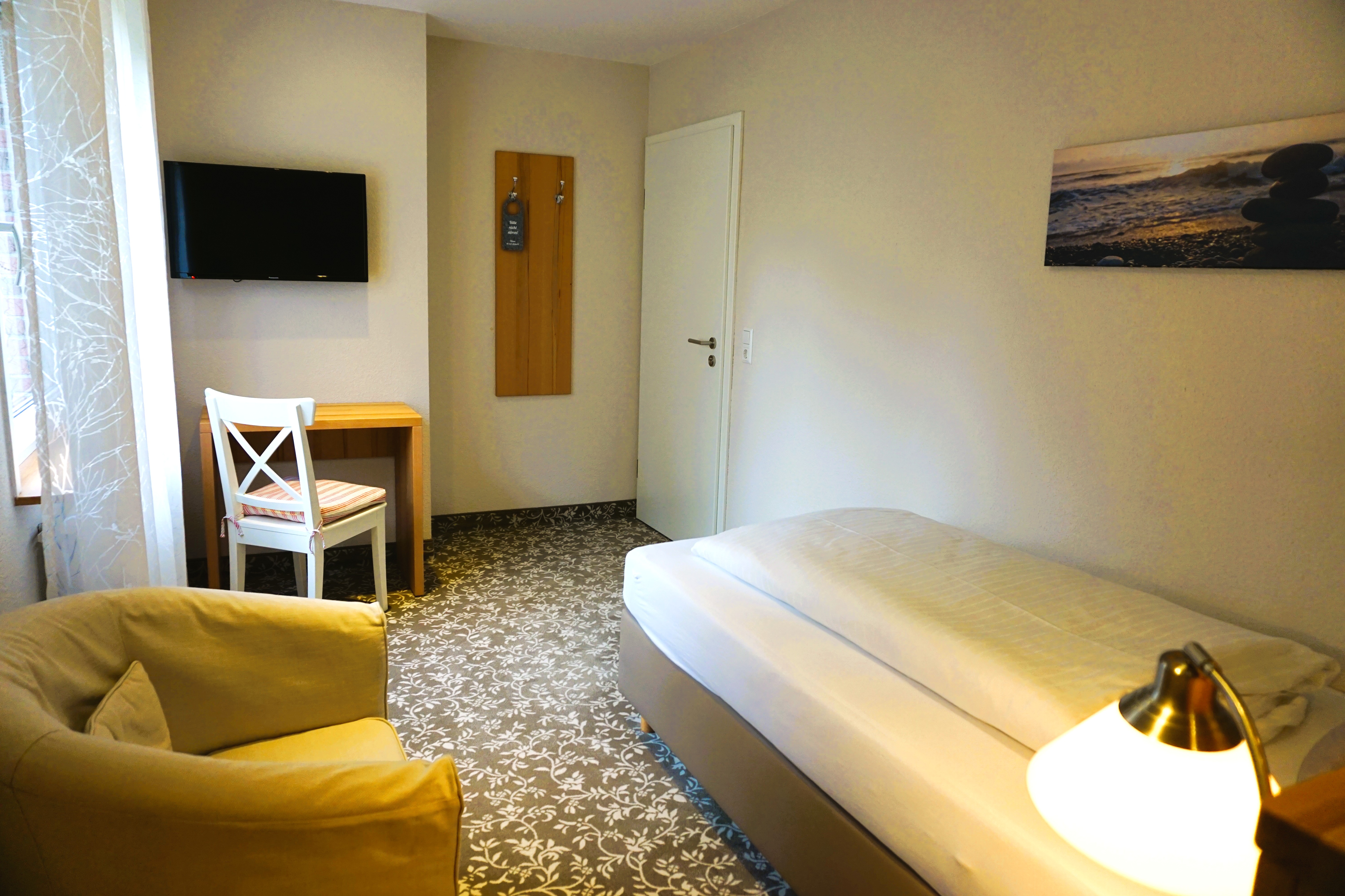 ... is on the first floor with a view to the garden and is equipped with a single bed (1.00 x 2.00 m), desk, armchair, satellite TV, free WiFi, shower and hairdryer. Bed linen, towels, soap and shower gel/ shampoo are part of the equipment.