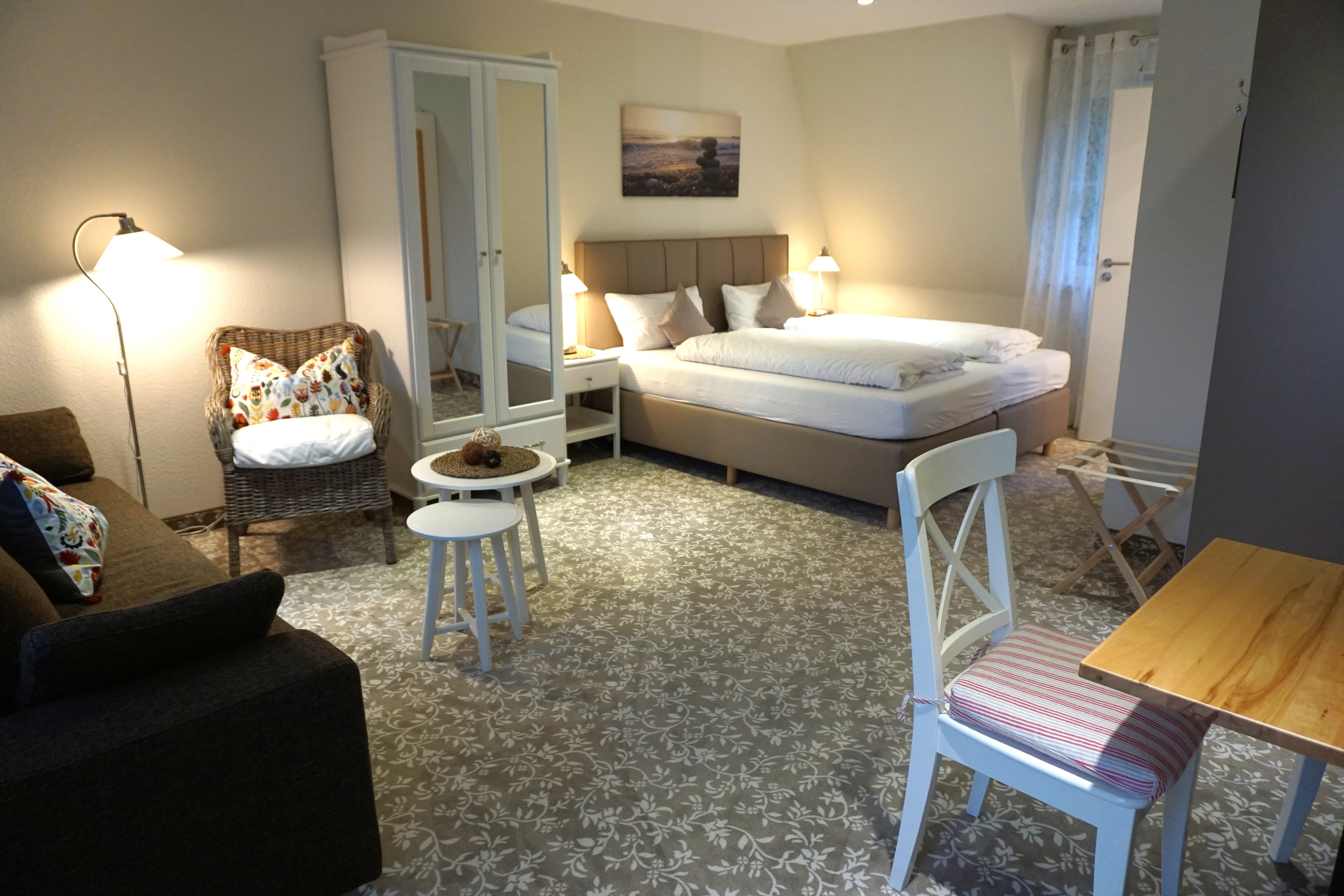 ... can accommodate a maximum of 3 adults or 2 adults and 2 children. It is on the upper floor with a view tothe garden and is equipped with a double bed (1.80 x 2.00 m, lounge area with sofa bed, satellite TV, free WiFi, shower and hairdryer. Bed linen, towels, soap and shower gel/ shampoo are part of the equipment.