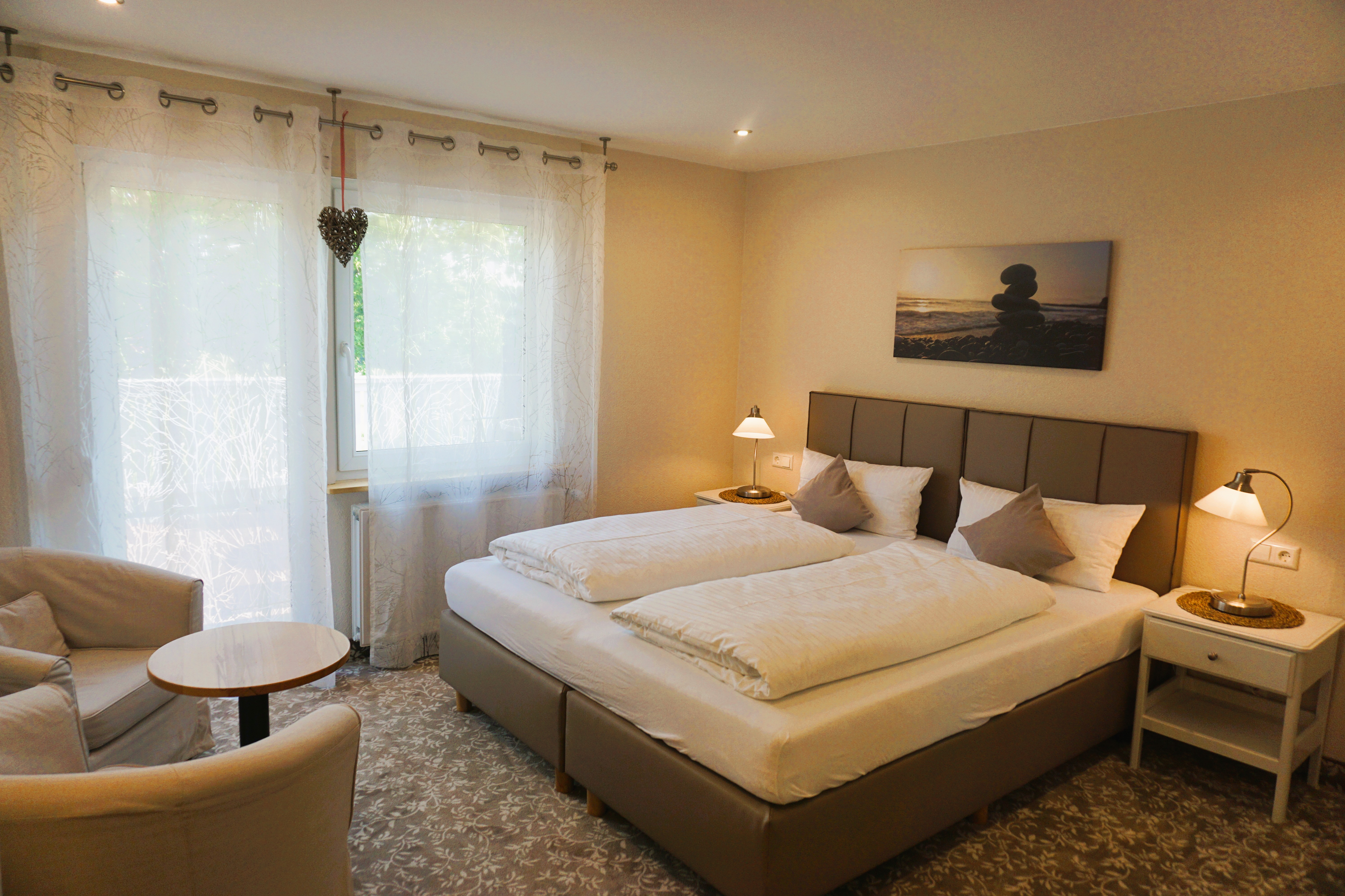 ... is on the upper floor with a view to the forests and is equipped with a large balcony, double bed (1.80 x 2.00 m), satellite TV, free WiFi, shower and hairdryer. Bed linen, towels, soap and shower gel/ shampoo are part of the equipment.
